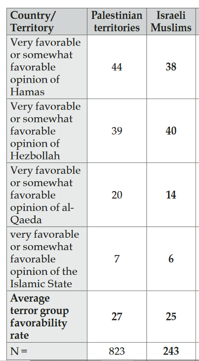 Here we can see a clear difference between the low level of support for ISIS and the high level of support for terrorism committed by Hamas and Hezbollah. It would be among the 40% of the population supporting anti-Israel terrorism that attitudes toward a number of variables would be instructive. And I doubt whether attitudes toward democracy would prove significant at all.
