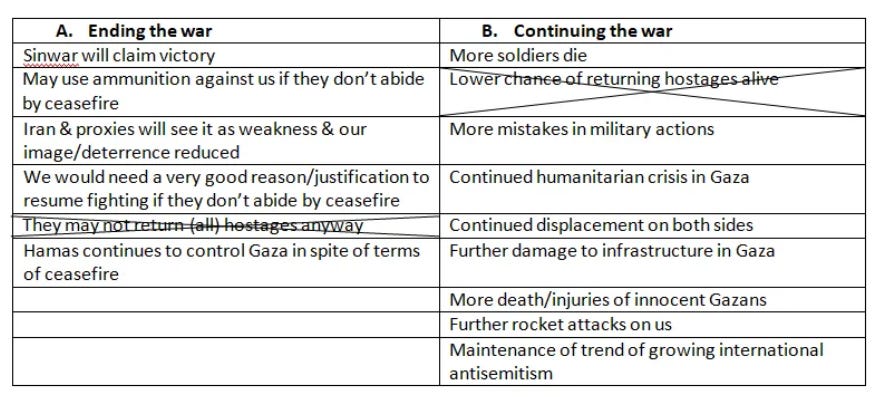 The benefit Fox finds for ending the war, that can be stated as a cost of continuing it, is that Israel will not be able to avoid having to come up with a “day-after plan.” Fox suggests that a deal now would allow Israel “to sidestep the burden of finding an alternative governance solution in Gaza, as well as any reconstruction efforts.” As if that is a good thing. I do not agree and “the day after” will be the subject of a future article.