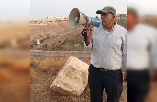 Demonstrating outside the Yeshiva of Maaley Adumim. Calling on yeshiva students to demonstrate against arms sales. Image courtesy of Elie Joseph.