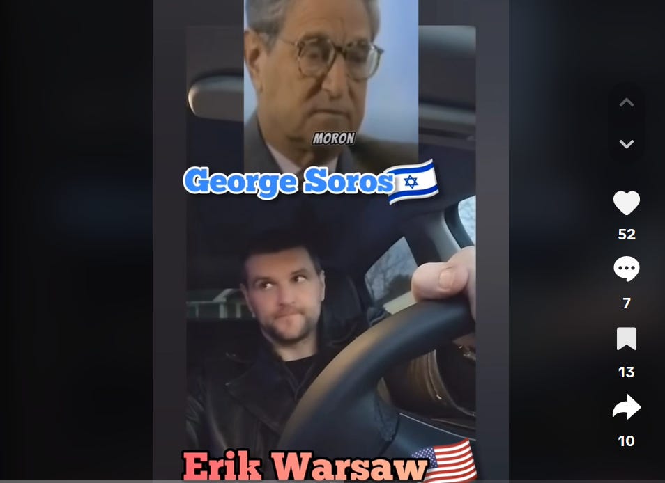 P.S. Just a curiousity. I couldn’t help but notice this clip where he accuses Soros of being “an evil rich person who exploits [various national] economies to get rich while causing you inflation.” I accuse Soros of a lot of things, but being a Jew (which he is only because his mother was) who is loyal to Israel (which he hates) is not one of those things. I think Soros would have a fit were he to see the Israeli flag next to his name. I deliberately took the screenshot when he was called a moron by the speaker Eric uploaded for this piece. I would use stronger language, but that will do for now.