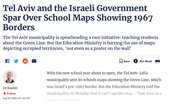 The Tel Aviv municipality is spearheading a rare initiative: teaching students about the Green Line. But the Education Minister is barring the use of maps depicting occupied territories, ‘not even as a poster on the wall’