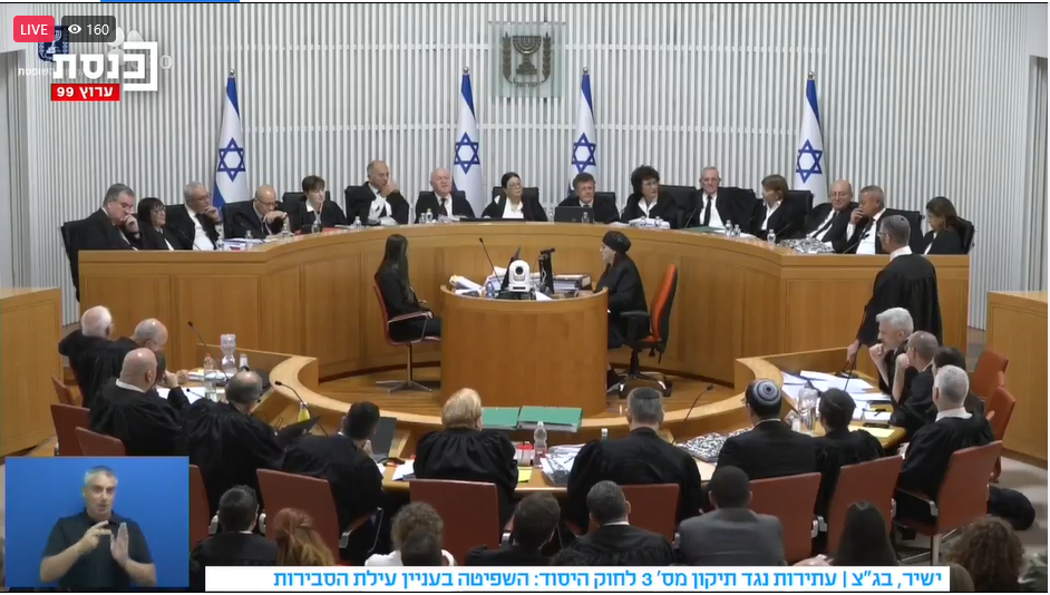 Almost an hour ago, the session in the Supreme Court hearing arguments for and against the Reasonableness Clause, an amendment to Basic Law:Judiciary began. The proceedings are televised and each network station will add their own interpretations and opinions regarding what is happening before us in what has been called a most historic event. Why historic? The entire 15-member panel of judges is sitting on this case and it is the first time that a Basic Law is being challenged in court, whereas basic laws are supposed to be regarded as comprising an unofficial constitution and, therefore, not open to challenge by the courts unless there is something seriously illegal in the law.