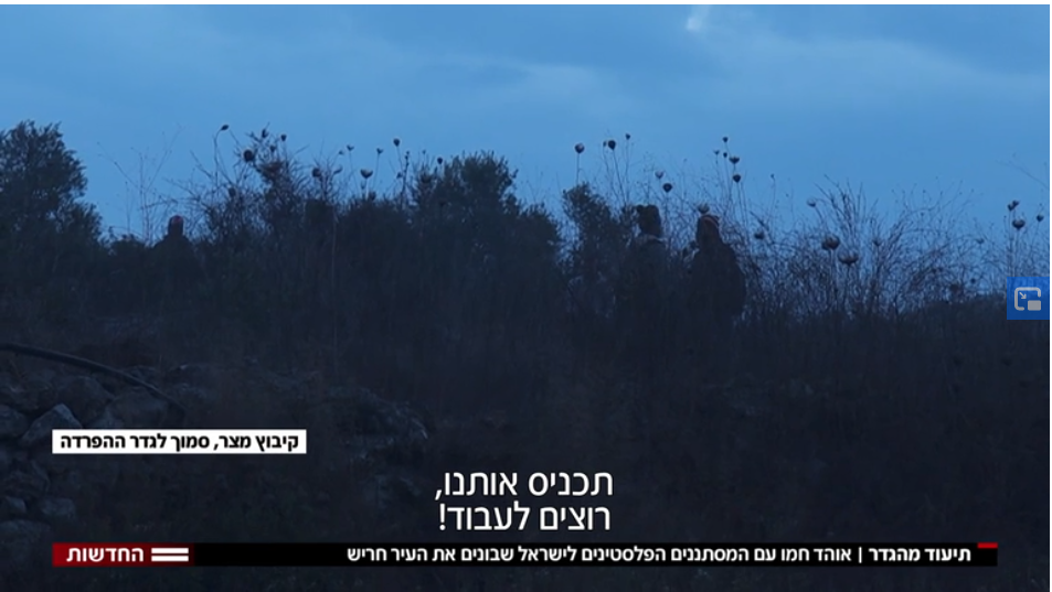 The figures in the bushes are Palestinian Arabs on the PA side of the border fence. One of them shouts out to IDF soldiers the same age as him: “Let us in. We want to work.”