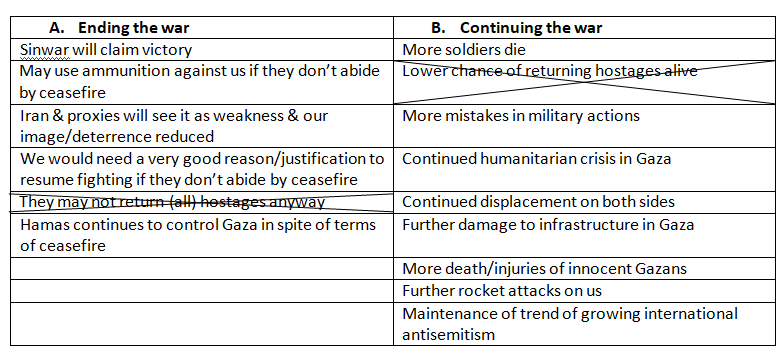 It is important to note that this is not the way I would have conducted this exercise were I to have the privilege of doing it with someone who actually has responsibility for making decisions — it was one more attempt on my part to understand those who are out blocking traffic on the streets and making a lot of noise demanding we end the war NOW to bring the hostages home NOW.