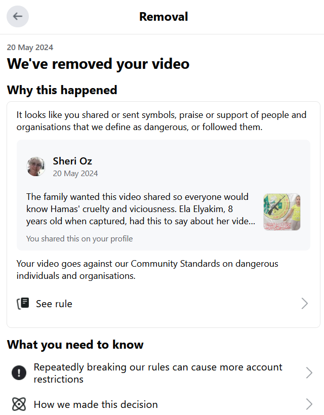 Facebook provided no option for me to appeal their decision. If you tell me my post does violate community standards, I will accept the decision without further fuss. * * * * * I love how FB claims to remove only those items that threaten the community’s basic rights to respect and safety. (Read the following with the proper tone of sarcasm:) I must say that I appreciate their efforts and feel we Jews are totally respected and safe (from vile hate and accusations) on their platform. Early this morning, I posted the video recently released by the IDF — a video of then 8-year-old Ela Elyakim, who was taken hostage by Hamas on Oct 7th. If I remember correctly, this is the approximate text that I wrote above the video: The family wanted this video shared so everyone would know Hamas’ cruelty and viciousness. Ela Elyakim, 8 years old when captured, had this to say about her video: she was made to change her clothes and forced to repeatedly recite the script they gave her. The script says: I am Ela Elyakim, Noam’s daughter [her father was murdered in the very house from which she and her sistern were abducted], 8 years old, and I ask Bibi to release us and I am a hostage of Hamas. https://www.israeldiaries.com/wp-content/uploads/2024/05/ela-elyakim-video.mp4 Within moments, I received this message: Clicking on the “See rule” arrow, I got this: Not content to settle for this, I looked for a way to appeal the decision — note that there was no “appeal” button on their removal post, unlike something else I did successfully appeal. I wrote this up on their “Report a problem” box in their Help and Support section of my Facebook account. This is what I wrote: You removed a video claiming it goes against community standards. It fits NONE of the categories in your list of violations of community standards. It is a video that remains up in a number of other FB posts and pages (and rightly so). I don’t know who you think this post is supporting — certainly NOT Hamas. It is supporting an 8-year-old little girl who was abducted on Oct 7th. Her family wants her video shared so people know what she was up against. So please tell me: in praise of what person or organization considered dangerous is this post? Perhaps my English could have been better worded, I admit. Not great style for one who considers herself a writer (and sometimes editor), but it does not matter a bit. When I tried to submit this report-a-problem, it failed. I tried different variations, from sending the screen shots they required, to sending only one screen shot. Each attempt to submit failed. Don’t worry: I did submit the problem with report-a-problem not submitting. Don’t remember where right now because I was so frustrated with them, I closed the screen down as soon as it went through. Do I expect a response, you ask? Nope. I did repost the same video from the IDF Facebook page and it is still up. Go figure! The only reason I care is because I don’t want to accumulate too many strikes against me because I have no desire to be in FB jail for any length of time at all. So far, I have been able to avoid it. Post navigation Still calling for “Make love not war” after Oct 7th Hostage Naama Levy is a peace activist