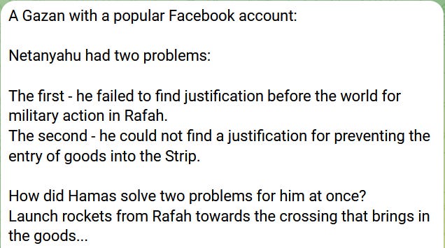 2. Abu Ali Express in English writes: “The launchings of Hamas from Rafah towards Kerem Shalom gave Israel justification for the action in Rafah, saved them, and gave them a way out in the eyes of the whole world. How stupid is Hamas.” He also likes my title as he, too, wrote that Hamas bites the hand that feeds it, shooting at the place that brings them aid.