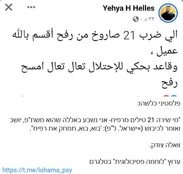 My translation into English, To any Palestinian: “Whoever launched 21 missiles from Rafah — I swear to Allah that he is a collaborator, sitting and saying to the Occupier (i.e., Israel): ‘Come, come, wipe out Rafah.”
